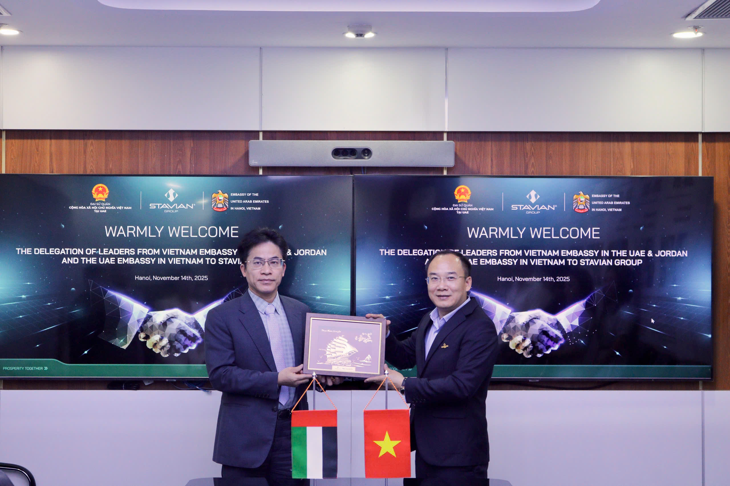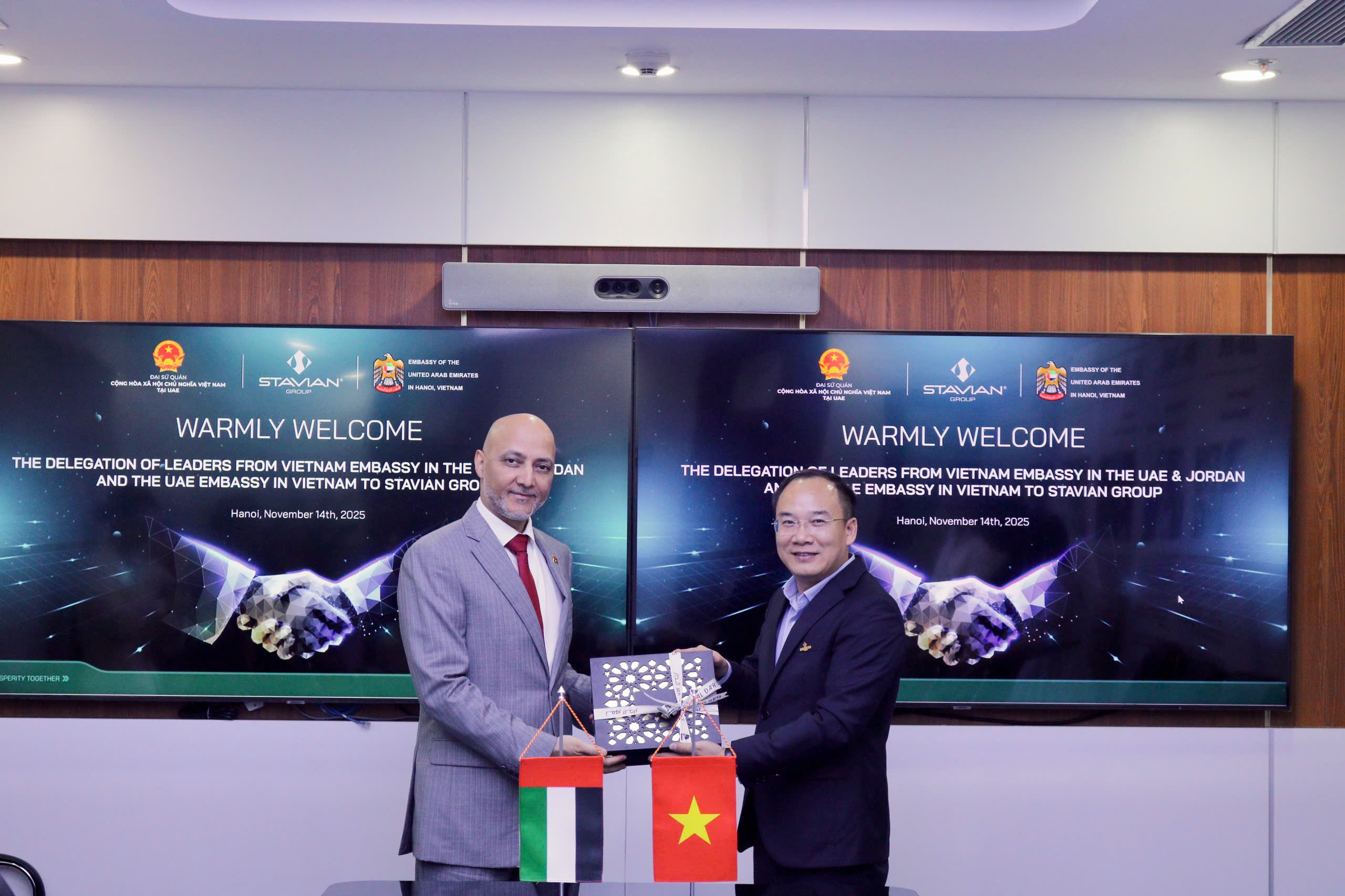 On November 14th, 2025, Stavian Group had the honor of welcoming H.E. Nguyen Thanh Diep – Ambassador of the United Arab Emirates and Jordan, and H.E. Dr. Bader Abdullah Al Matrooshi – Ambassador of the United Arab Emirates (UAE) in Vietnam at Stavian Group’s Headquarters, Hanoi. The cooperation between Vietnam and the UAE has achieved many positive results in recent years, especially in economic and trade relations. Bilateral trade reached over USD 6 billion in 2024, demonstrating the significant potential for deeper cooperation between the two nations. The Vietnam – UAE relationship has made important progress in recent years, serving as a foundation to further promote collaboration in the coming period across many priority sectors.