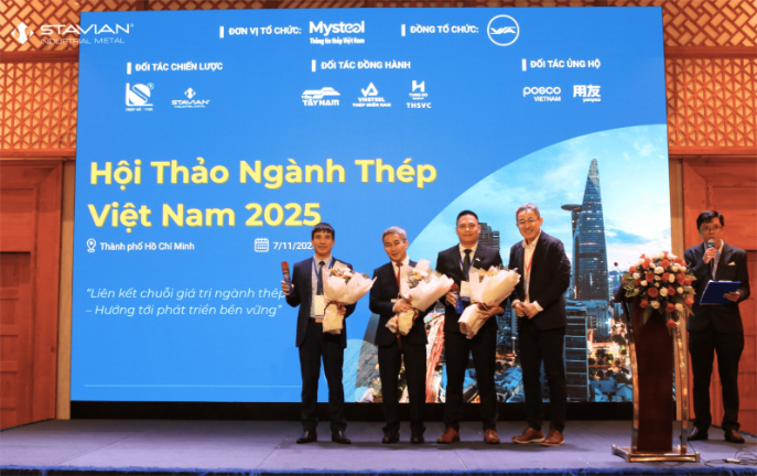 On November 7, 2025, at the Tan Son Nhat Pavillon Convention Center in Ho Chi Minh City, Stavian Industrial Metal Joint Stock Company – a member of Stavian Group proudly participated in the Vietnam Steel Industry Conference 2025 as a Strategic Sponsor and Keynote Speaker, organized by Mysteel Vietnam in collaboration with the Vietnam Steel Association (VSA)